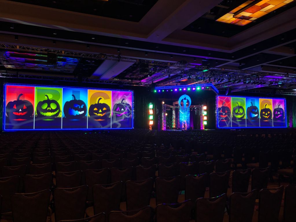On Halloween of 2019 the crew and I running the ConnectWise IT Nation GS had a bit of fun with the stage between sessions. The rigging was a fun engineering challenge for this stage; I had to fully redesign it to accommodate for a lower ceiling from the previous year, and incorporate a kabuki drop on the downstage chevron truss.